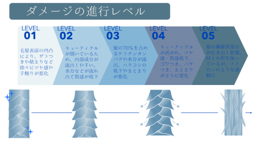 ハイレベルのダメージを受けている髪は、キューティクルが剥がれむき出しの状態となっているため、この影響で、髪を黒くする・生えてくる機能が低下し、薄毛や抜け毛、白髪へとつながるといわれています。